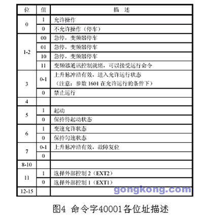 TVF2000的菜單參數(shù)被一一影射為MODBUS協(xié)議的寄存器,MODBUS通訊對各寄存器的操作,即實(shí)現(xiàn)了對TVF2000中與寄存器對應(yīng)的菜單參數(shù)的操作.對應(yīng)的命令寄存器為40001,其中每一位控制的具體內(nèi)容如圖4所示.