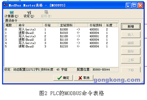 本控制系統(tǒng)主要以MODBUS通訊控制實(shí)現(xiàn)。因此,主控設(shè)備和受控設(shè)備必須都支持MODBUS協(xié)議,永宏P(guān)LC提供了方便快捷的MODBUS MASTER表格,直觀易懂,如圖2所示。其中,第0,2,4筆資料為分別寫入1#2#3#變頻器控制字和給定值1;第1,3,5筆資料為讀取 1#2#3#變頻器的狀態(tài)字。