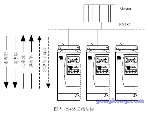 時代TVF2000系列變頻器可通過串行RS485總線與外部PLC控制系統(tǒng)進(jìn)行通訊,通訊協(xié)議為MODBUS的RTU形式,其控制命令和給定頻率全 部來自MODBUS通訊,其RS485總線結(jié)構(gòu)如圖3所示。TVF2000變頻器的寄存器40001為控制字,寄存器40002為給定值1,寄存器 40004為狀態(tài)字,寄存器40005為實(shí)際值。其相關(guān)參數(shù)設(shè)置如下: