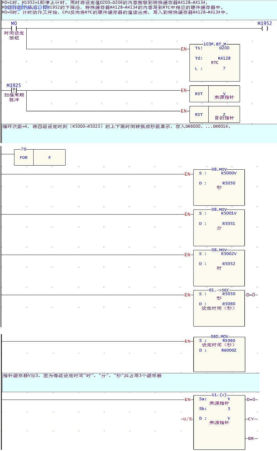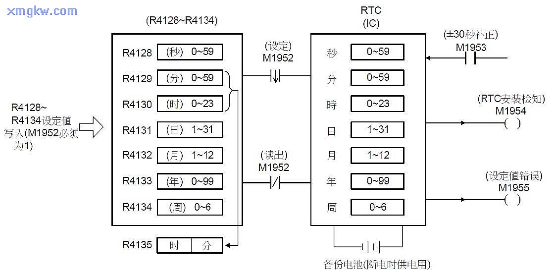 在M1952 由1→ 0 瞬間將 R4128~ R4134的設(shè)定值寫到 RTC中相對(duì)應(yīng)的硬件緩存器中。在M1952回到0 后計(jì)時(shí)動(dòng)作開始,同時(shí)每次掃描 CPU 將反向地將 RTC中的時(shí)間值讀出,寫到 R4128~ R4134 去。