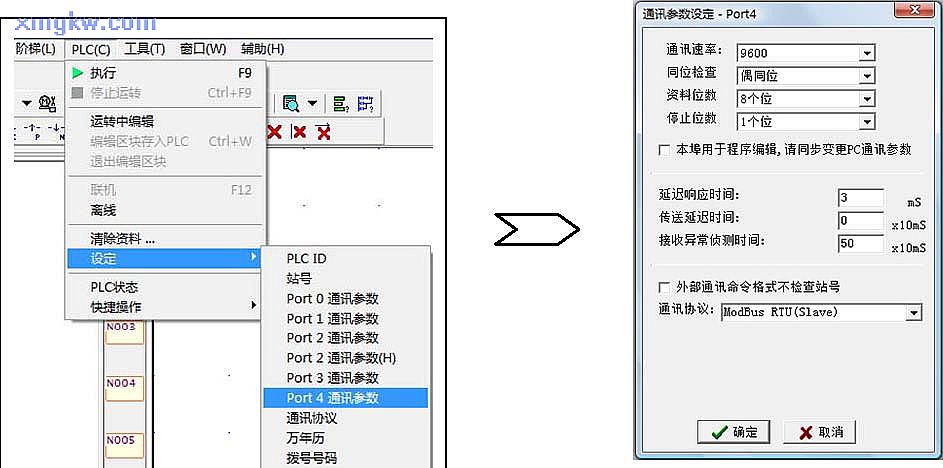 【PLC通訊參數(shù)設(shè)置】點(diǎn)選菜單欄的“ PLC” ?“設(shè)定”?“Port4通訊參數(shù)”,通訊協(xié)議選用 ModBus RTU(Slave),通訊格式為 9600,E,8,1。如下圖所示: