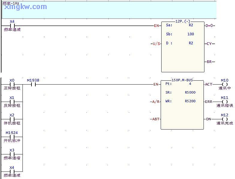 z設(shè)置變頻器主頻率為 60Hz正方向啟動(dòng)。z讀取英威騰 CHE100系列變頻器運(yùn)行頻率和設(shè)定頻率,并將其分別存于 D0、D1中。z遠(yuǎn)程手動(dòng)微調(diào)頻率,以 1Hz為單位。