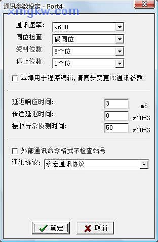 【PLC通訊參數(shù)設(shè)置】 點(diǎn)選菜單欄的“ PLC”?“設(shè)定” ?“Port4通訊參數(shù)”,通訊格式為 9600,E,8,1。如下圖所示: