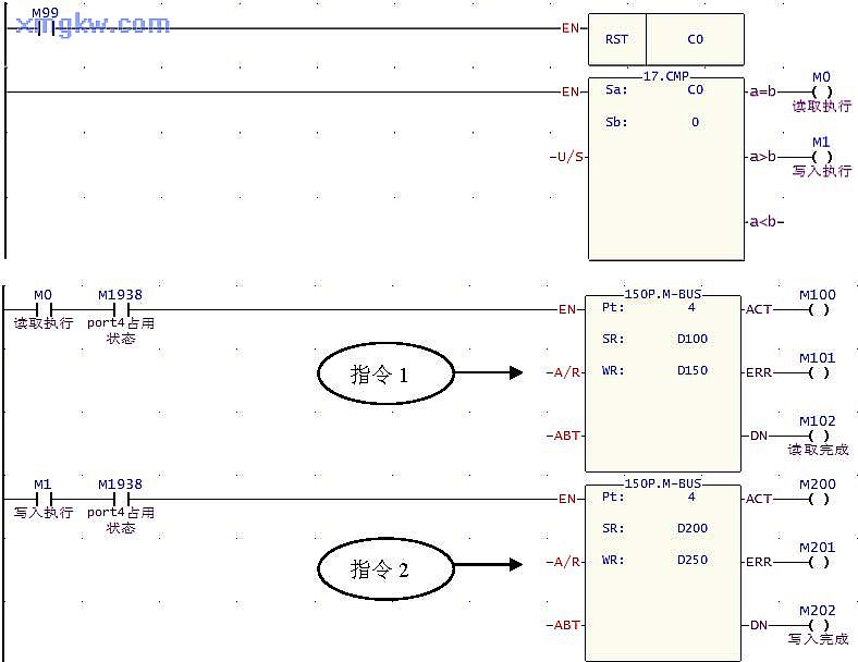 4. FUN150.M-BUS執(zhí)行狀態(tài)標(biāo)志有 “ACT”,“ERR”,“DN”。PLC一開始RUN就比較 C0是否等于 0,若C0=0,執(zhí)行讀取命令,當(dāng)讀取完成 “DN”輸出M102,使C0加1,又通過比較指令,當(dāng) C0=1時(shí)輸出M1,執(zhí)行 “寫入”指令,當(dāng)寫入完成時(shí) “DN”輸出M202,使C0復(fù)位,而 C0=0時(shí)輸出 M0,如此循環(huán)不斷地控制兩個(gè) FUN150.M-BUS指令的執(zhí)行。