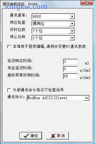 【通訊口參數(shù)設(shè)定】 PLC通訊口的參數(shù)需要與伺服驅(qū)動(dòng)器一致。點(diǎn)選菜單欄的“ PLC” ?“設(shè)定” ?“Port4通訊參數(shù)”,將參數(shù)設(shè)為“9600baud,偶同位 ,數(shù)據(jù)位7,停止位 1”,接收異常偵測(cè)時(shí)間設(shè)為 500ms,采用 ModBus ASCII(Slave)通訊協(xié)議。