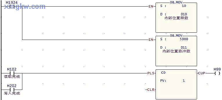 1. PLC開機(jī)脈沖 M1924將內(nèi)部位置轉(zhuǎn)數(shù),內(nèi)部位置脈沖數(shù)存放到 D10、D11中。