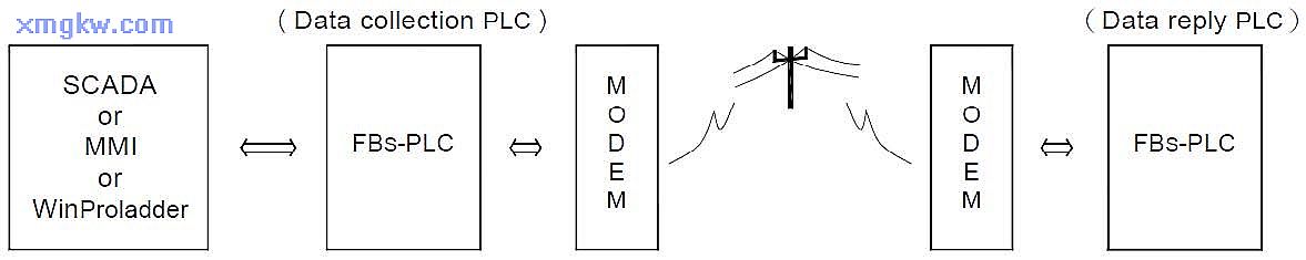 PLC 可經(jīng)由通訊端口 1 接MODEM通過電信網(wǎng)絡(luò)與遠(yuǎn)程的 PLC 聯(lián)機(jī)共享數(shù)據(jù),應(yīng)用如下: