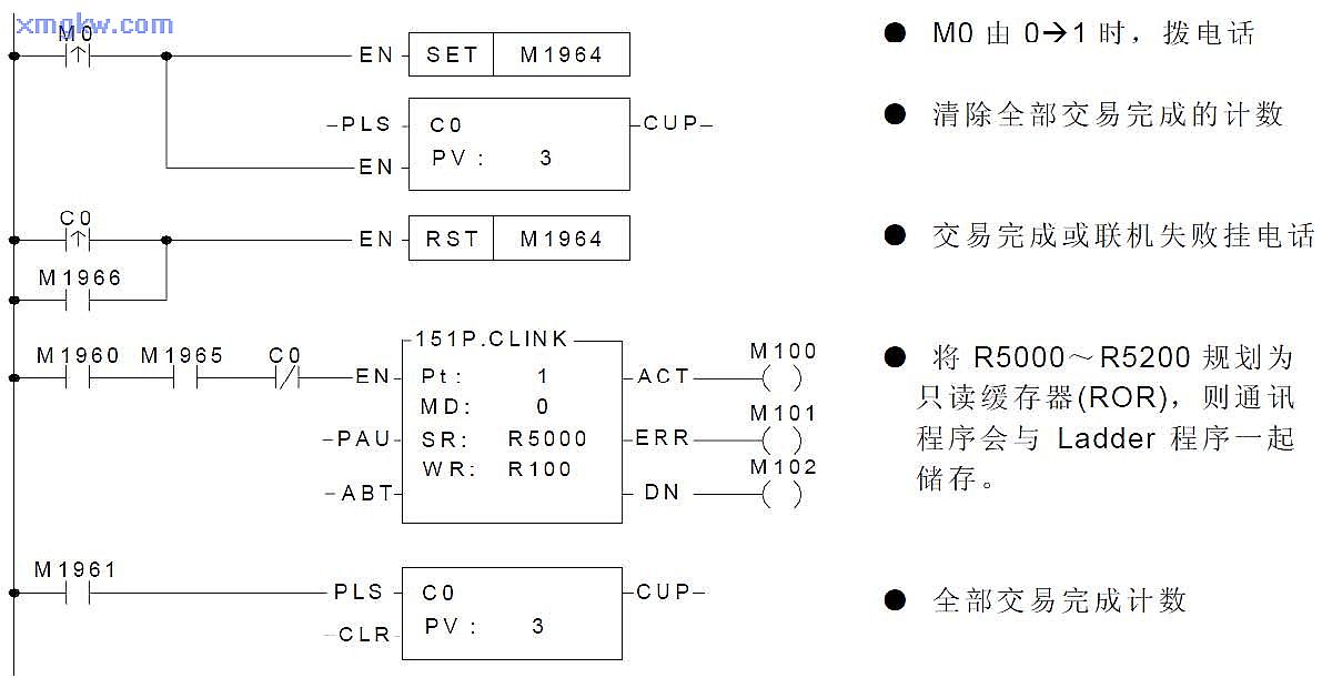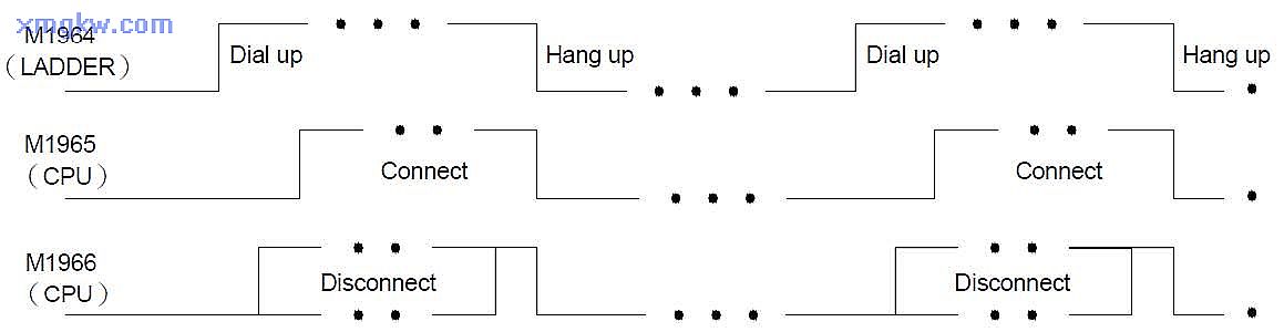 【MODEM 撥號(hào)接口信號(hào)】 M1959:OFF,撥號(hào)方式為〝 Tone〞;ON,撥號(hào)方式為〝 Pulse〞。 M1964:OFF→ON,撥號(hào)。 ON→OFF,掛電話。R4163:R4163的低字節(jié) (Low Byte)用來控制 MODEM撥號(hào)時(shí) X指令的應(yīng)用