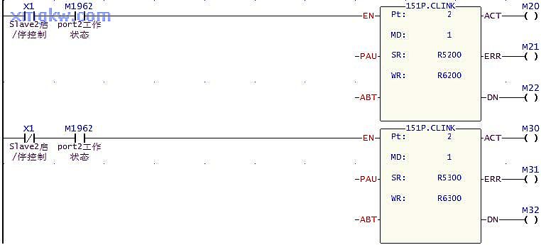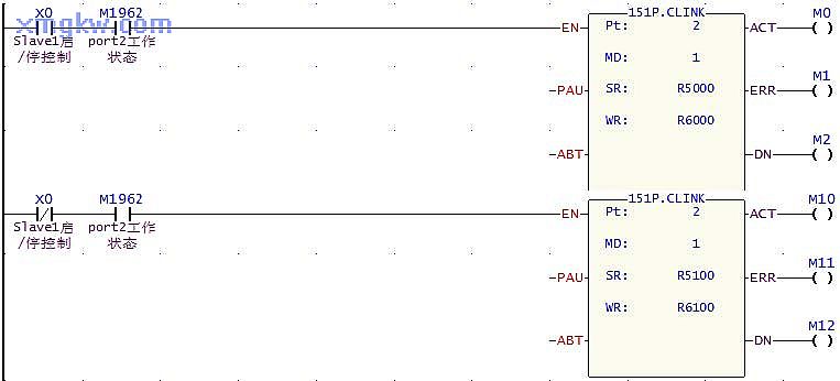 1. X0,X1兩個(gè)開(kāi)關(guān)的 ON/OFF狀態(tài)分別對(duì)應(yīng)兩臺(tái) slave PLC的run/stop,因此在程序中用這四個(gè)狀態(tài)啟動(dòng) 4個(gè) CLINK指令,發(fā)送通訊命令,即可達(dá)到控制要求。
