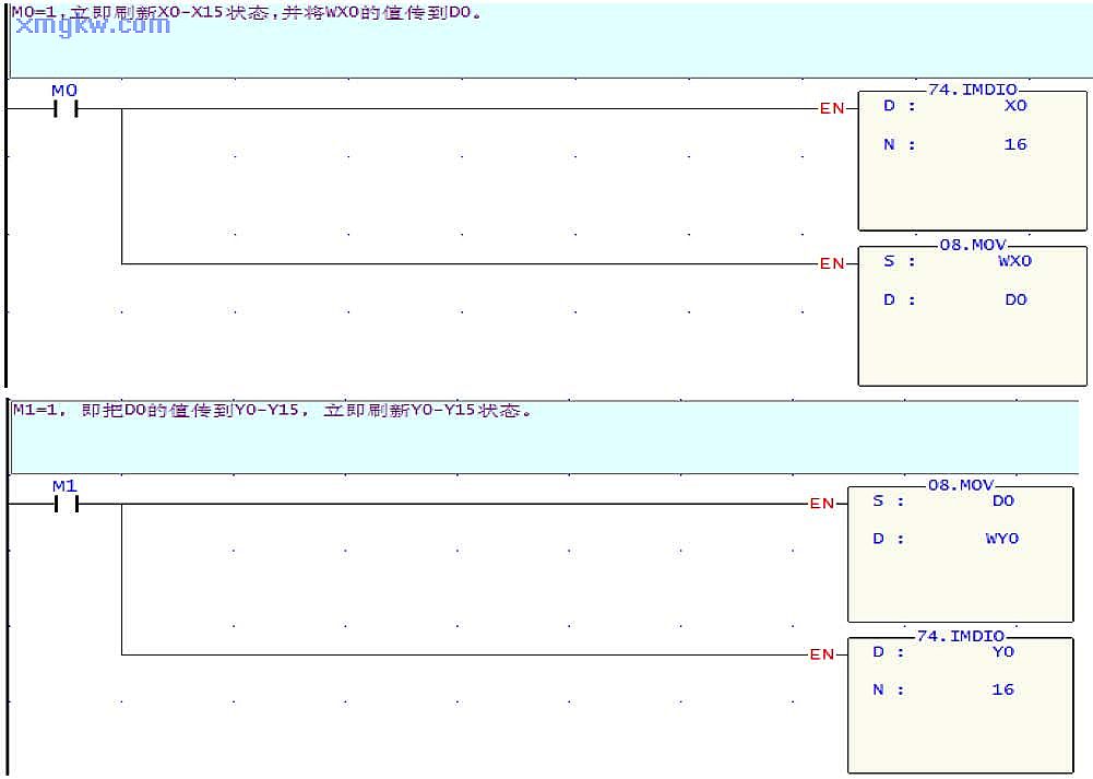 1. 當(dāng) M0=ON時(shí),立即刷新 X0~X15的狀態(tài),并將其狀態(tài)值傳送到 D0;當(dāng) M1=ON時(shí),將 D100的值傳送到 Y0~Y15,并立即將其輸出到輸出端,不必等到 END指令結(jié)束才 Y0~Y15狀態(tài)輸出到輸出端。