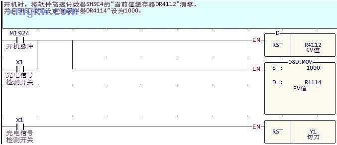 - 切刀下切,切割動作完成時, X1=ON。則SHSC4的計數(shù)值被清零, Y1被復(fù)位,切刀歸位, X1=OFF。這樣,SHSC4又重新計數(shù),重復(fù)上述動作,如此反復(fù)循環(huán)。