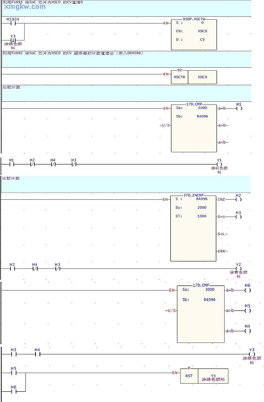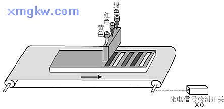 【控制要求】用紅、黃、綠三種顏料對傳送帶上的產(chǎn)品進(jìn)行涂料操作。傳送帶滾軸每轉(zhuǎn)動(dòng) 1000圈,換一種噴涂顏料,三種顏料循環(huán)使用。例如:紅、黃、綠、紅、黃、綠、紅 ……