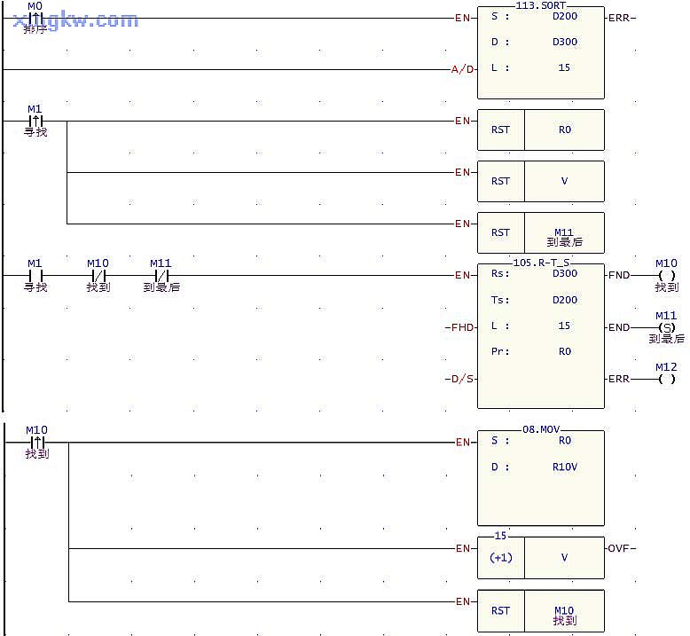 1.排序命令按鈕 M0由OFF→ON,即對存儲在 D200~D214的15個數(shù)據(jù)進行由小到大的排序,將結(jié)果存放到 D300~D314中。