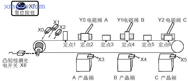產(chǎn)品進入傳送帶前自動通過三個識別傳感器檢測出產(chǎn)品類型,A類型產(chǎn)品將在定點 2通過電磁閥送到 A產(chǎn)品箱, B類型產(chǎn)品將在定點 4被送到 B產(chǎn)品箱, C類型產(chǎn)品將在定點 6 被送到 C產(chǎn)品箱。