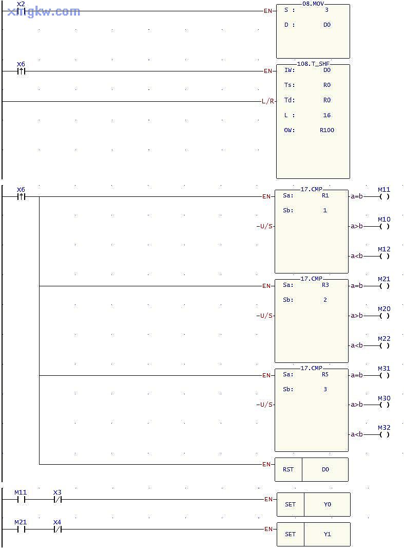 當(dāng)凸輪旋轉(zhuǎn)一圈,傳送帶上的物品從一個定點移到另一個定點, X6由OFF→ON變化一次, T-SHF指令執(zhí)行,R0-R15的內(nèi)容往左移位一個寄存器;同時, CMP指令執(zhí)行,在定點 2(R1)判斷是否為 A產(chǎn)品、在定點 4(R3)判斷是否為 B產(chǎn)品、在定點 6(R5)判斷是否為 C產(chǎn)品,每次比較完成后, RST指令被執(zhí)行, D0被復(fù)位。