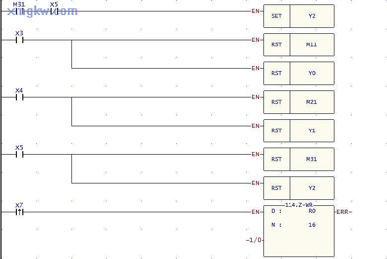 當(dāng)已確認將產(chǎn)品推到產(chǎn)品箱時, X3,X4,X5 將為ON,此時, RST 指令執(zhí)行,對應(yīng)的 A,B,C 電磁閥將被復(fù)位。