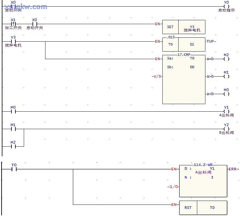 CMP指令也被執(zhí)行,且當 T0的當前值小于 D0的內(nèi)容值時, M0狀態(tài)為 ON,觸發(fā) Y1導通,開始輸送 A料;當 T0的當前值大于或等于 D0的內(nèi)容值時, M1或 M2狀態(tài)就會變?yōu)?ON,同時 M0狀態(tài)變?yōu)?OFF,此時 Y2導通, Y1關(guān)閉,則開始輸送 B料,停止輸送 A料。