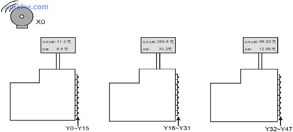 X0=OFF,F(xiàn)OR~NEXT循環(huán)執(zhí)行3次,H0被依次送到 R0~R2中,F(xiàn)OR~NEXT循環(huán)執(zhí)行完畢后,R0~R2的值被送到外部 Y輸出點(diǎn),所有 Y輸出被復(fù)位為 OFF,每個(gè)錢柜抽屜可以打開。