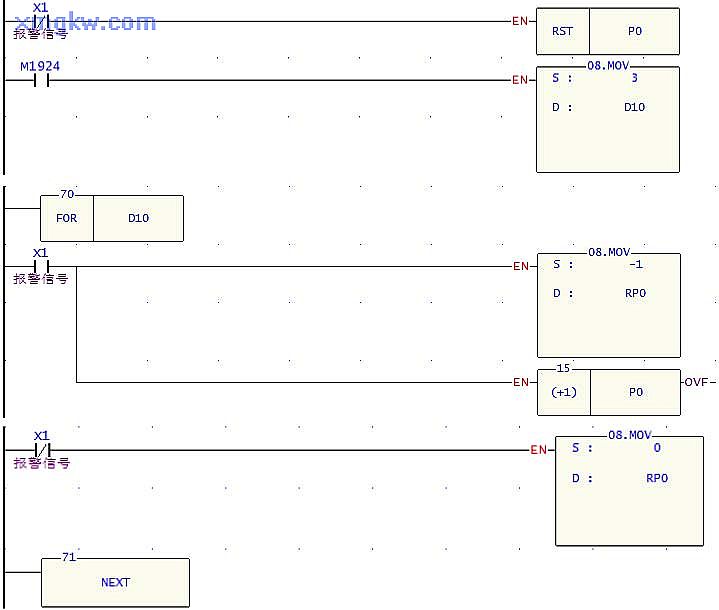 2. P0=0時(shí),RP0代表R0;P0=1時(shí),RP0代表R1;P0=2時(shí),RP0代表R2。當(dāng)警報(bào)響時(shí), X0=ON,F(xiàn)OR~NEXT循環(huán)執(zhí)行3次,F(xiàn)FFFH被依次送到 R0~R2中,F(xiàn)OR~NEXT循環(huán)執(zhí)行完畢后, R0~R2的值被送到外部 Y輸出點(diǎn),所有 Y輸出被置位為 ON,將每個(gè)錢柜抽屜鎖住。