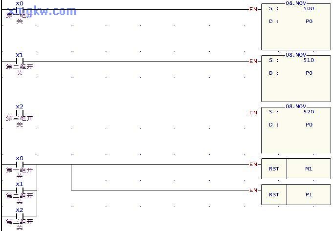 當選擇其中一組配方參數時, X0、X1、X2其中一個將變?yōu)?ON,P0的值將分別對應為 500、510、520, DP0將分別代表 D500、D510、D520,同時 [RST M1]指令執(zhí)行, M1復位變?yōu)镺FF,RST P1指令和 FOR~NEXT循環(huán)將被執(zhí)行,因 P1被復位變?yōu)?0,DP1代表D0。
