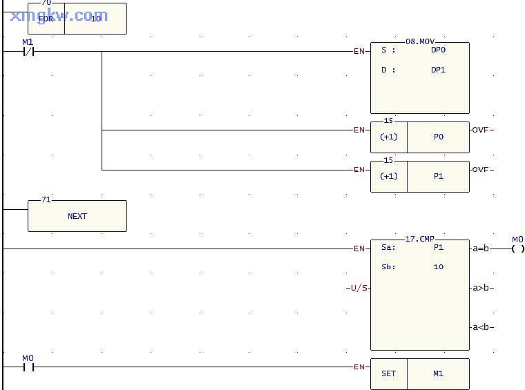 當循環(huán)次數到達時,即 P1=10,[SET M1]指令將被執(zhí)行, M1被置位變?yōu)?ON,F(xiàn)OR~NEXT循環(huán)中的指令因M1的常閉接點斷開而停止執(zhí)行。