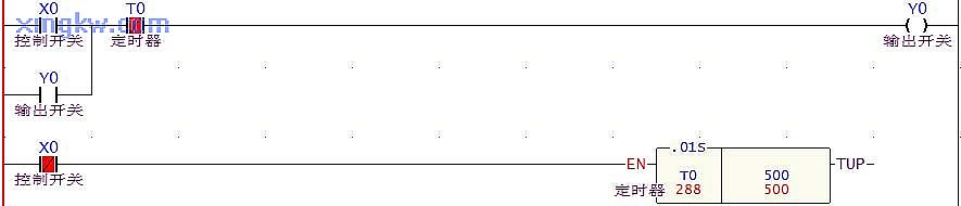 當(dāng)開(kāi)關(guān) X0接通為 ON時(shí)燈 Y0亮,當(dāng)開(kāi)關(guān) X0斷開(kāi)為 OFF時(shí),需再經(jīng)過(guò) 5秒鐘后 Y0燈才熄滅。【組件說(shuō)明】