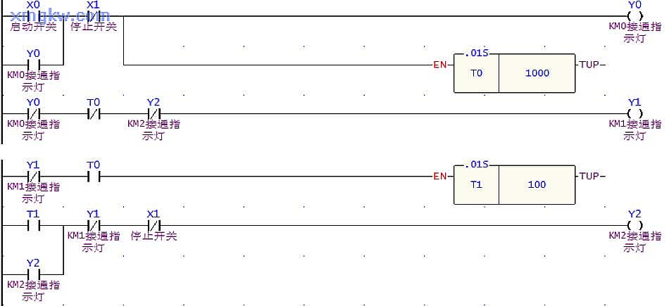 2. T0計(jì)時(shí)器到達(dá) 10秒預(yù)設(shè)值后, T0=ON,Y1=OFF,T1計(jì)時(shí)器開(kāi)始計(jì)時(shí),到達(dá) 1s預(yù)設(shè)值后, T1=ON,所以 Y2=ON,三角形正常運(yùn)行接觸器 KM2導(dǎo)通。