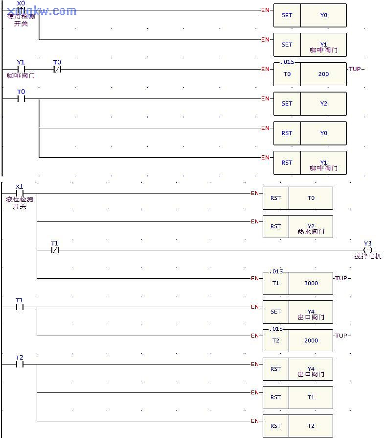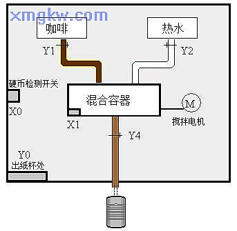 【控制要求】投入一枚硬幣后,出紙杯處彈出一個(gè)紙杯,同時(shí)出咖啡, 2秒鐘后出熱水,注入到一定量熱水后,攪拌電機(jī)運(yùn)行, 30秒后從咖啡流出口流出沖調(diào)好的咖啡。