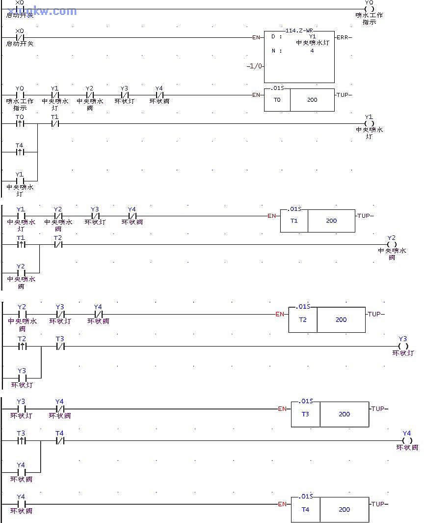 中央噴水燈、噴水閥、環(huán)狀噴水燈、環(huán)狀噴水閥需要順序動作,所以在 T1、T2、T3由OFF→ON變化時,“ SET”下次動做的同時,還需去做“ RST”本次的動作。用 Y1、Y2、Y3、Y4的常閉接點來關(guān)斷定時器,確保本次動作執(zhí)行時,其前一個動作的定時器被關(guān)閉。