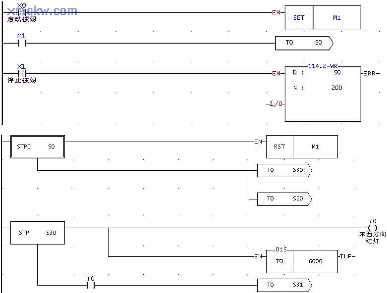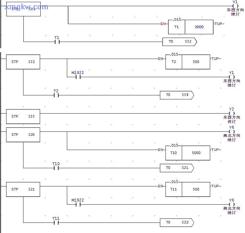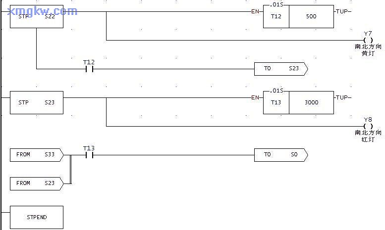 東西方向的黃燈亮時間( Y2)并沒有用定時器來控制,這是因為當南北方向紅燈亮時間結(jié)束后(同時也是東西方向黃燈結(jié)束時間), T13=On,在 S33 和 S23 都為 On 的狀態(tài)下,返回到步進點 S0,S33 和 S23 步進點對應(yīng)的 Y狀態(tài)被復位, Y2自然也被復位。