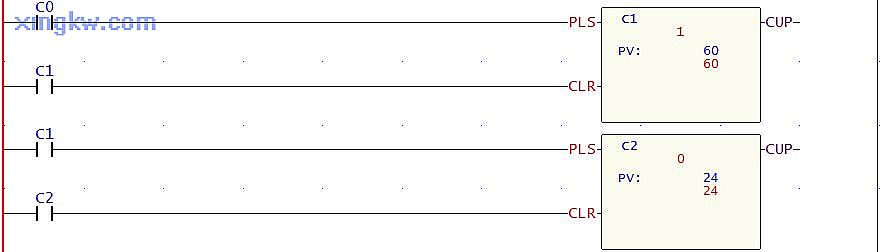 當(dāng)每個(gè)計(jì)數(shù)器的計(jì)數(shù)值和設(shè)定值PV相等時(shí),計(jì)數(shù)器的常開(kāi)觸點(diǎn)變成ON,會(huì)自行清零。