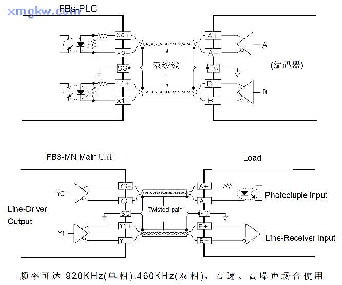 ● 發(fā)送AB相脈沖控制伺服電機,每秒發(fā)送 460000個脈沖給伺服電機?!?伺服電機接有編碼器,編碼信號接入 PLC高速計數(shù)輸入點 (差動輸入點 )。