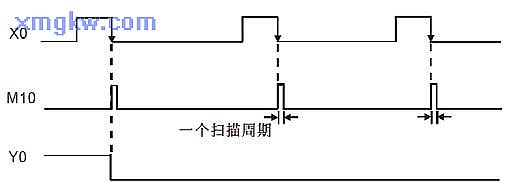 【控制要求】 開關(guān)由 ON→OFF動作時產(chǎn)生一個掃描周期的脈沖 M10,作為條件去觸發(fā)指示燈或其他裝置。