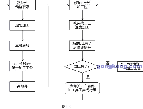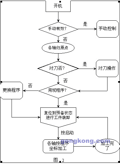 即利用各手動控制開關(guān)執(zhí)行手動操作的項(xiàng)目。若手動開關(guān)無效,則啟動原點(diǎn)復(fù)歸程序,各軸進(jìn)行機(jī)床原點(diǎn)復(fù)歸,先回Z軸再回其它兩軸,當(dāng)所有軸都原點(diǎn)復(fù)歸成功后 才能進(jìn)行到下一步。若刀具和工裝夾具、工件程序均沒有變動,可復(fù)位到加工預(yù)備狀態(tài)而不進(jìn)行對刀,若需對刀,則打開對刀開關(guān)啟動對刀程序,3軸分別對刀,即 找工件原點(diǎn),利用手動各軸移動開關(guān)快慢移動各軸,使工件的三個面分別碰觸低速旋轉(zhuǎn)的刀具,剛好碰上為止。對好后,按對刀OK確認(rèn),再輸入刀補(bǔ),經(jīng)過程序處 理,即形成工件原點(diǎn)也就是編程0點(diǎn),編程時根據(jù)此0點(diǎn)按照圖紙計算刀具路徑,可使操作者思路清晰,編輯運(yùn)算簡單。操作者編輯的是用戶程序,可以編輯刀具軌 跡,就是各軸移動坐標(biāo),還有移動速度、循環(huán)加工時的循環(huán)次數(shù)等。編好程序后或使用當(dāng)前程序時,即復(fù)位到預(yù)備狀態(tài):各軸移動到初始位—一個合適的位置,裝卸 工件方便、不易碰觸刀具時,裝上工件,按啟動即可開始加工,主軸運(yùn)轉(zhuǎn),冷卻液開,各軸按程序設(shè)定坐標(biāo)移動。當(dāng)加工結(jié)束時,機(jī)床復(fù)位,即各軸又移動到初始 位,主軸停,冷卻關(guān),這時可卸下工件,完成加工過程。